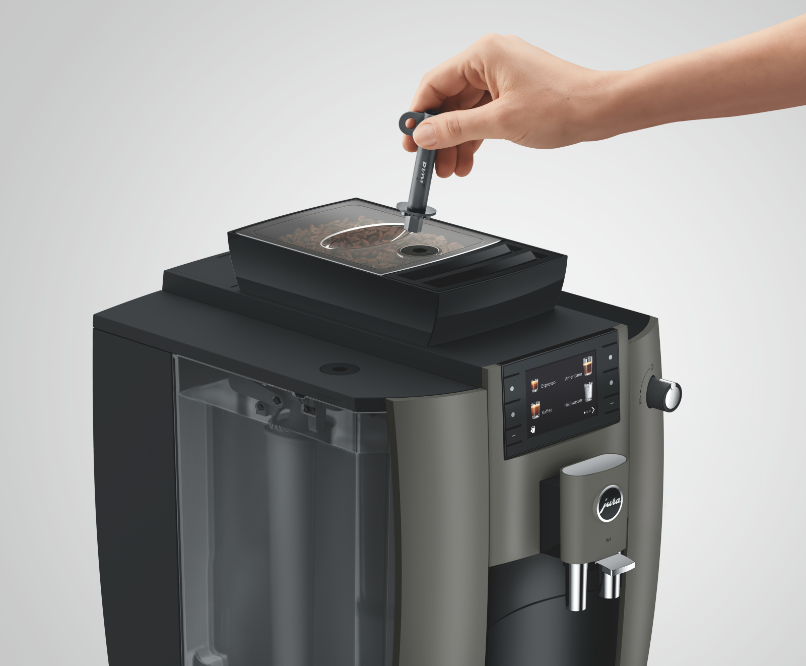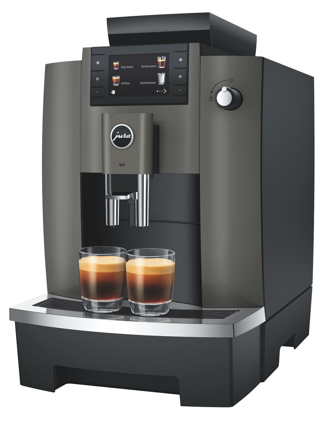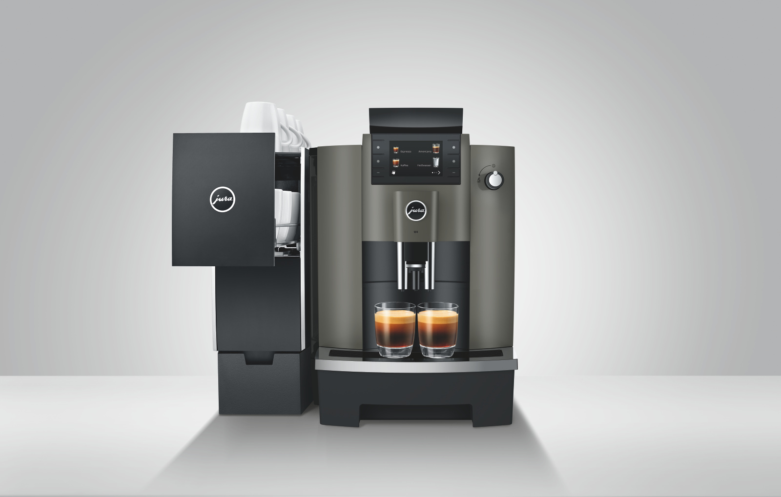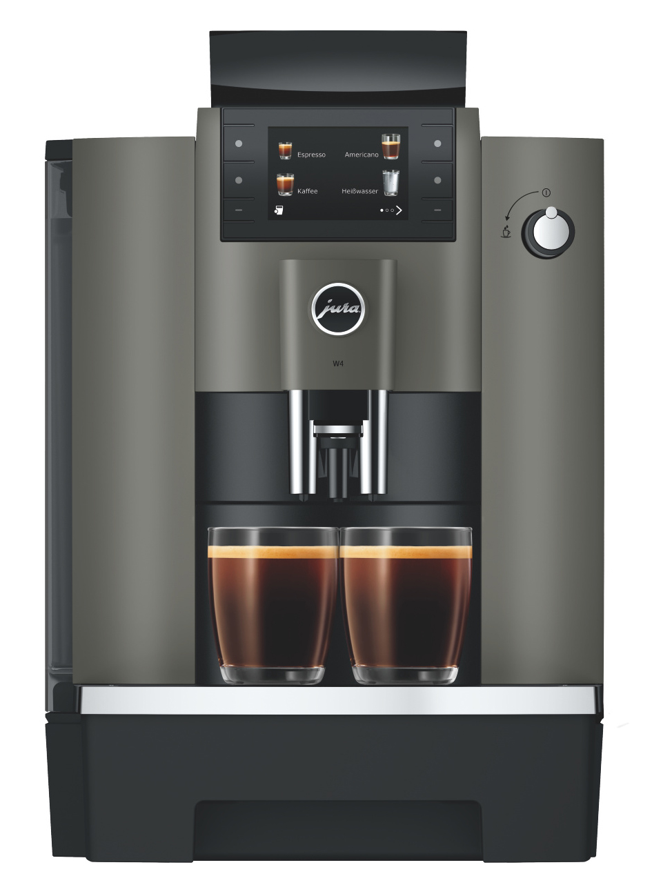Kompakt gebaut und mit dem Komfort ausgestattet, den man im geschäftlichen Umfeld erwartet: Die W4 ist ein besonders robuster und professioneller Pure-Coffee-Vollautomat, der durch seine außergewöhnliche Benutzerfreundlichkeit überzeugt.Zum modernen Technologiepaket der W4 zählt der Professional Aroma Grinder (P.A.G.2). Er mahlt von der ersten Tasse an hochpräzise und verleiht Schwarzkaffeespezialitäten eine aromatische, klare Intensität. Ergänzt wird diese Pure-Coffee-Kompetenz durch die One-Touch-Lungo-Funktion für verlängerte Kaffeevarianten sowie den Puls-Extraktionsprozess (P.E.P.®) für einen besonders intensiven Espresso.Das Design folgt strikt der Funktionalität und greift zugleich die zeitlose Eleganz von JURA auf. Ein Farbdisplay, übersichtlich angeordnete Fronttasten und ein Drehknopf für die Heißwasserzubereitung sorgen für eine einfache, intuitive Bedienung. Perfekte Hygiene auf Knopfdruck sowie abschließbare Komponenten erleichtern den sicheren Einsatz im täglichen Betrieb.Die klare Formensprache unterstreicht den modernen Auftritt der W4, während vielfältige Programmieroptionen maximale Flexibilität bieten. Sowohl Pulver- und Wassermenge als auch verschiedene Sperrfunktionen lassen sich individuell anpassen. Mit einem 3-Liter-Wassertank und einem 500-Gramm-Bohnenbehälter ist die W4 ideal für Standorte, an denen täglich bis zu 50 Schwarzkaffeespezialitäten benötigt werden.
